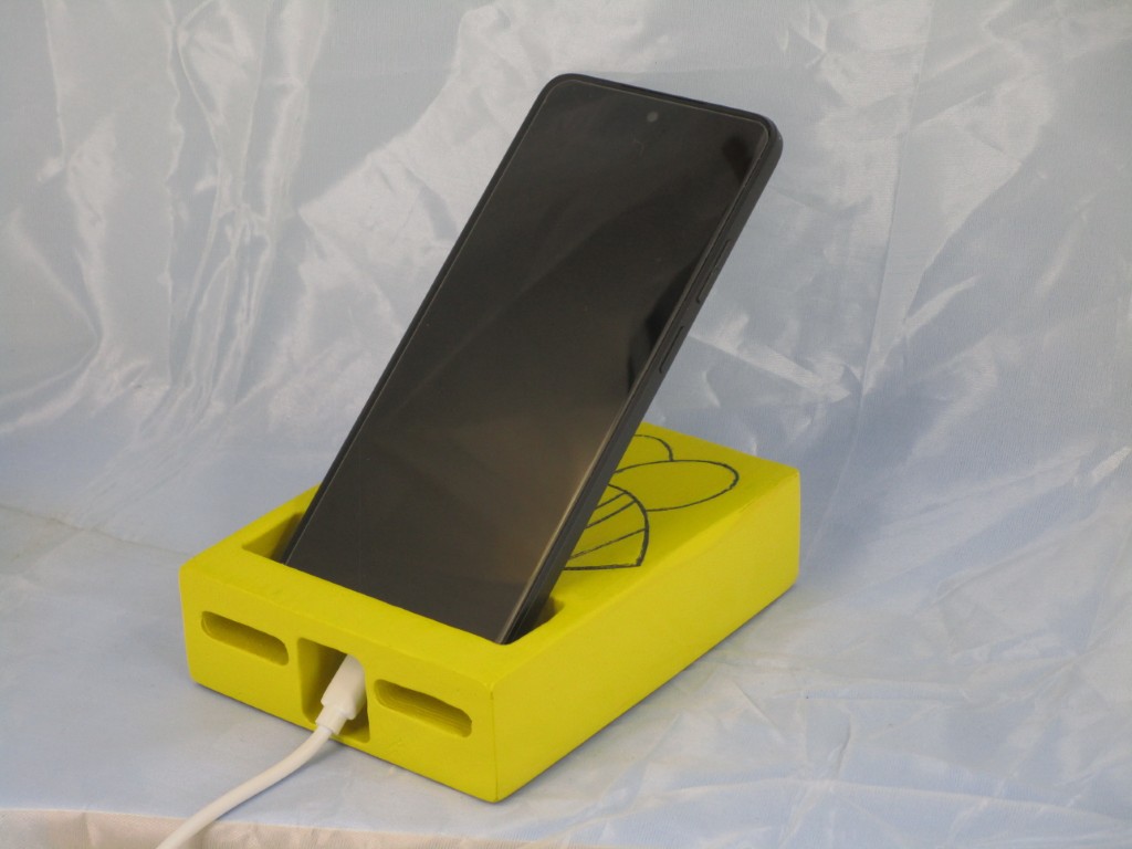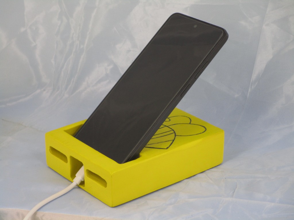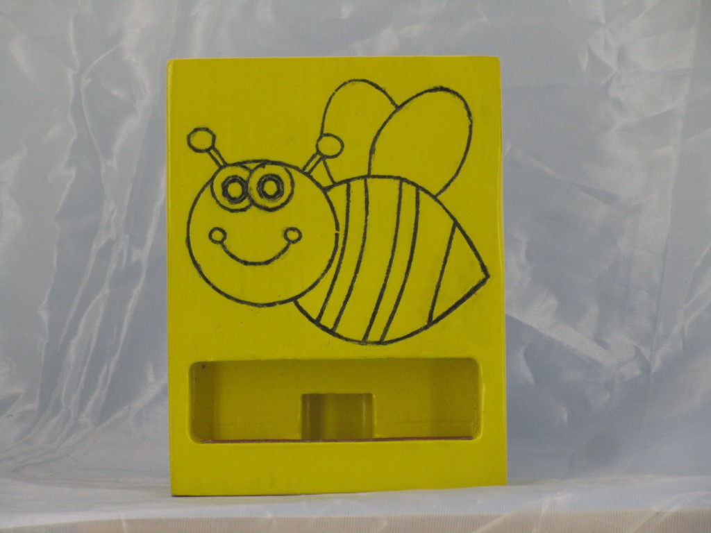 Wooden Painted Phone Stand with a cute bee design, perfect for holding cell phones.