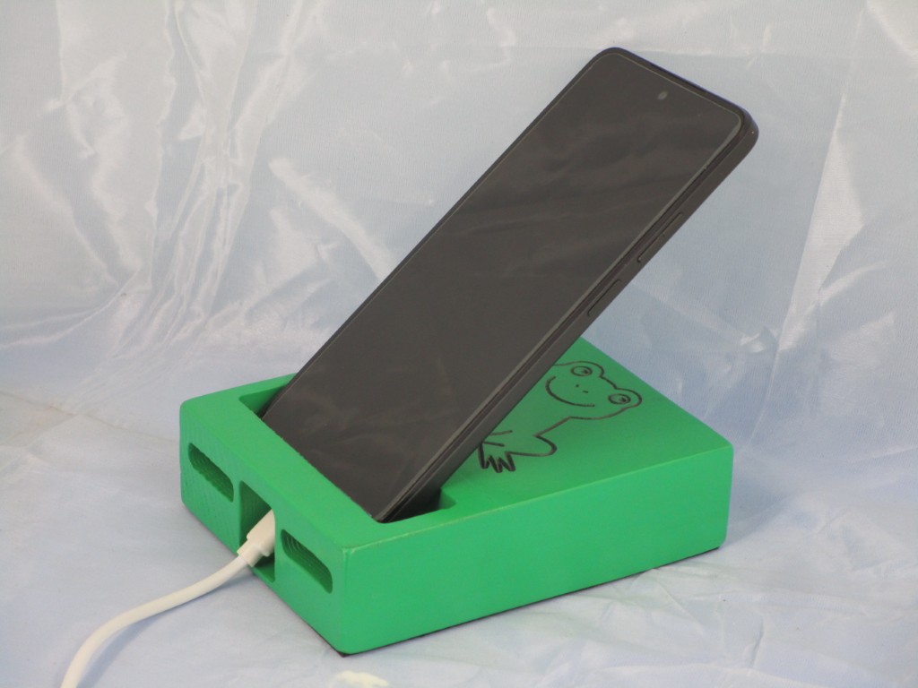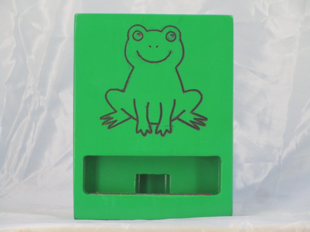 Wooden Painted Phone Stand with a cute green frog design, perfect for holding cell phones.